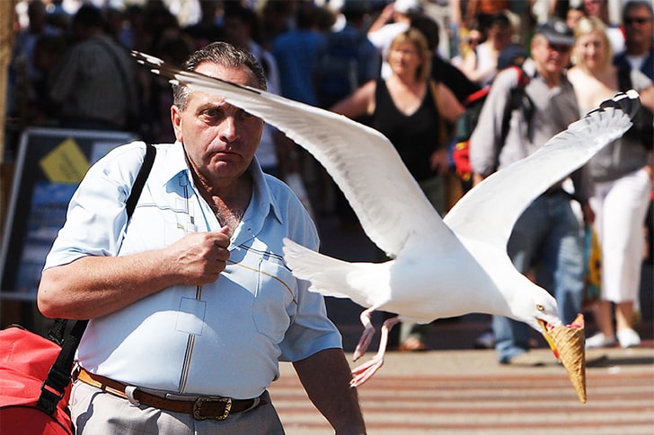 Er konnte dabei aber nicht ahnen, dass er das Opfer eines hinterhältigen Diebstahls werden würde, der ihm die Eiswaffel wegschnappte. Eine Möwe steckte hinter dem Raub bei Tageslicht, der glücklicherweise in einem perfekt getimten Foto festgehalten wurde. Der Gesichtsausdruck des Mannes, der die Tüte noch in der Hand hält, ist unbezahlbar.