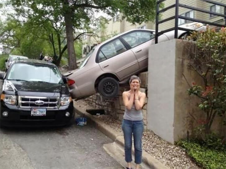 How did this woman park her vehicle on the side of a building? It’s possible she neglected to put her ride in park, causing it to slide down and collide with this Ford. If we’ve been more objective here, perhaps the Ford is the woman’s vehicle.