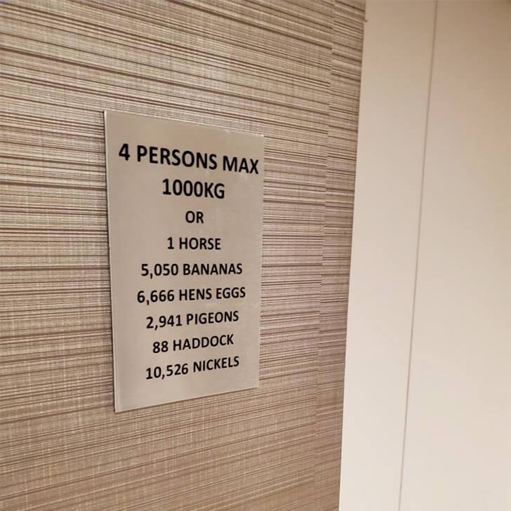 Il est notamment établi qu’un ascenseur avec une charge maximale de 1000 kg peut transporter jusqu’à 13 personnes à la fois. Les indications de ce panneau suggèrent cependant que l’ascenseur ne peut pas supporter plus de 4 personnes à la fois, et le reste des instructions n’est pas plus censé.