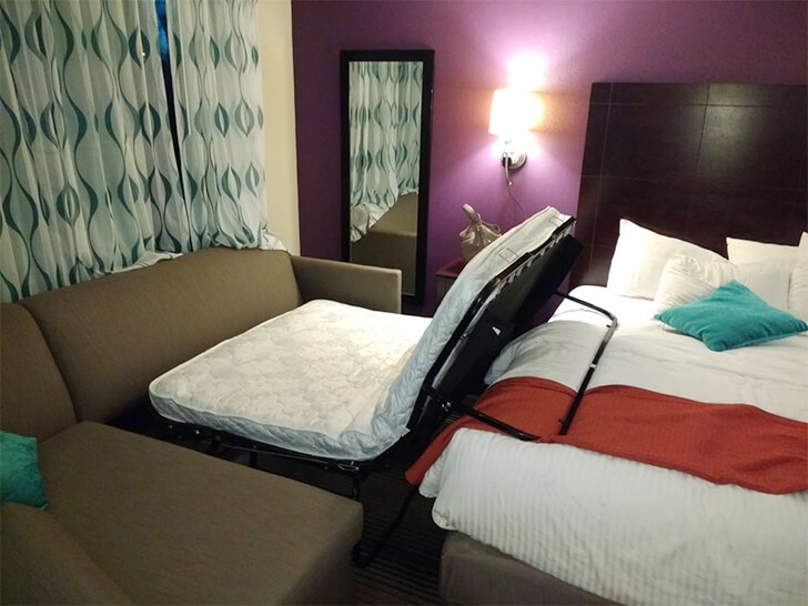 Cette chambre est visiblement trop étroite pour avoir deux lits, et ce, même si l’autre lit est un modèle pliable comme sur cette photo. On ne peut aussi que se demander pourquoi ils ont installé un grand canapé à côté alors qu’il n’y a pas assez de place pour accéder au miroir.
