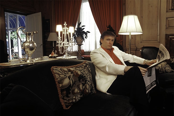 In this visually striking image, Donald Trump exudes sophistication. He’s dressed in a white jacket and cinnamon-colored shirt paired with sharp black pants and holding a newspaper. The luxurious surroundings reflect the opulence he was accustomed to from a young age.