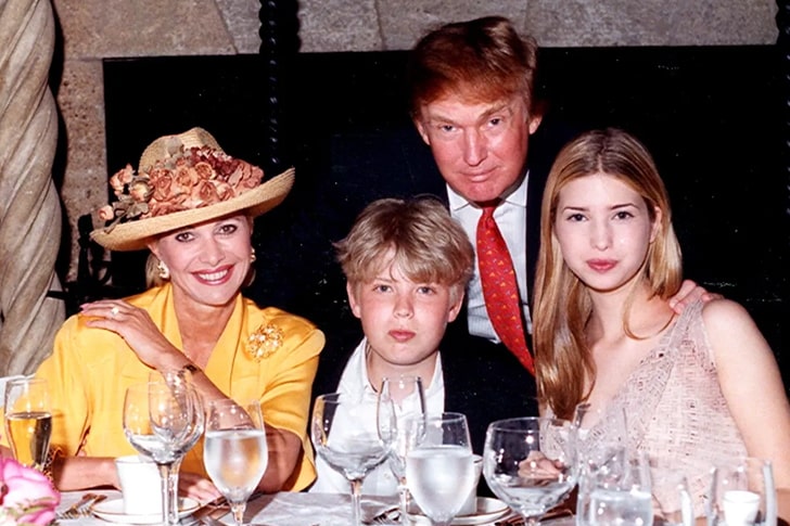In this family portrait, Donald Trump and Ivana Trump share a dinner table with their young children, Ivanka and Eric, capturing a moment of familial unity. Their marriage spanned from 1977 to 1992 and was marked by high social visibility and business collaborations, ultimately ending in a highly publicized divorce.