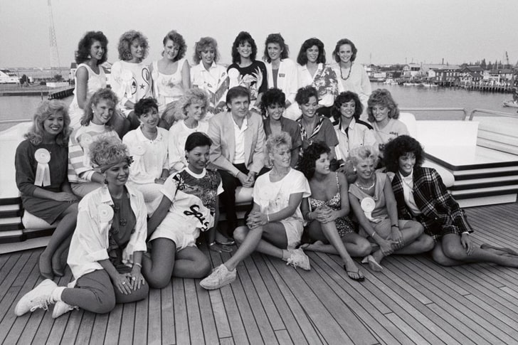 Donald Trump, seen here surrounded by a radiant group of women aboard his 281-foot yacht “Trump Princess,” exemplifies his high-profile tenure as part owner of the Miss Universe, Miss USA, and Miss Teen USA pageants from 1996 to 2015. His approach to running these pageants was as much about spectacle as it was about competition, often utilizing his luxurious yacht for events and photo ops.