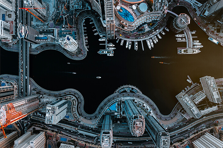 Carmine Chiriacò’s photo showcases the intricate architectural designs of the buildings, streets, and pier of Dubai Marina from a unique aerial perspective. The contrasting view of the ocean water against the modern structures creates a futuristic image that unveils a new angle of this popular tourist destination.