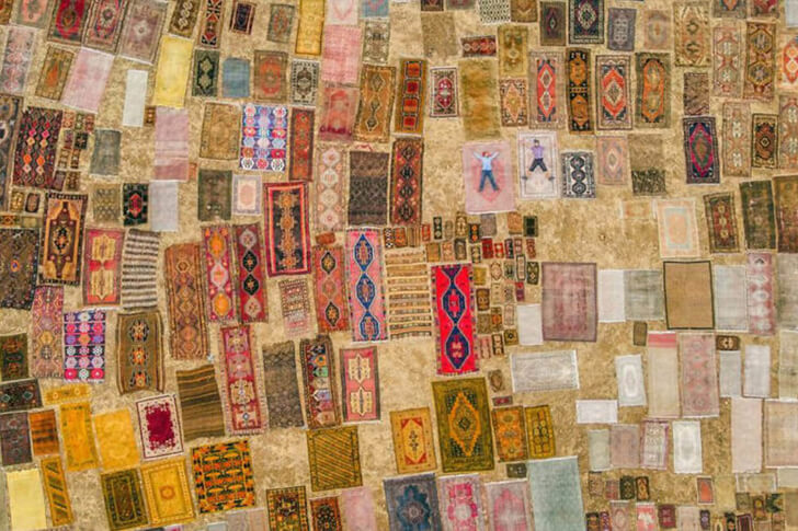 The use of a drone, though the specific model remains unknown, has allowed for capturing this panoramic, high-altitude shot, showcasing the exquisite craftsmanship and cultural significance of these rugs. However, there are potential degradation risks with prolonged sun exposure on the delicate carpet fibers.