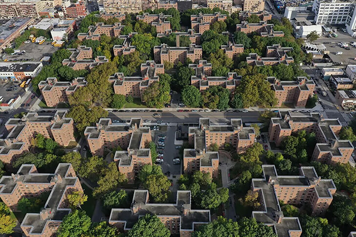 The DJI Phantom 3 Pro, a top-performing drone in its time, still captures stunning shots like this one of the projects in Brooklyn, New York. Providing a bird’s-eye view of the area, this clear photo sheds light on the public housing’s unique architecture and high population density.