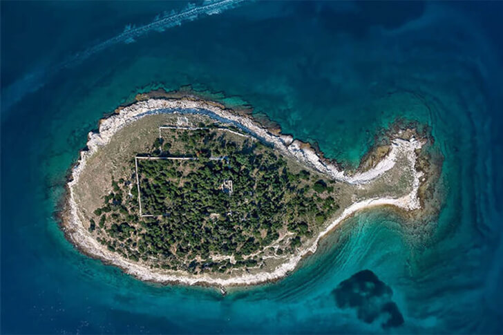 Gaz Island, part of the Brijuni Islands in the Adriatic Sea, Croatia, is a unique landmass resembling a fish from above. Despite its small size, it stands out as one of the few islands in the world with such a distinctive shape. Located within the Brijuni National Park, Gaz is one of the twelve tiny inlets that make up this natural wonder.