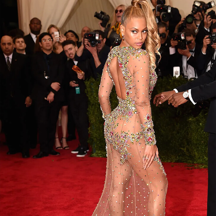 Radiating elegance and confidence, Beyoncé stole the show at the 2015 Met Gala in a stunning gown crafted by Givenchy’s creative mastermind, Riccardo Tisci. The sheer and embellished masterpiece hugged her curves, adorned with intricate patterns and crystals that shimmered under the lights. With a high slit and a flowing train, Beyoncé commanded attention with every step, effortlessly blending glamour and sophistication.