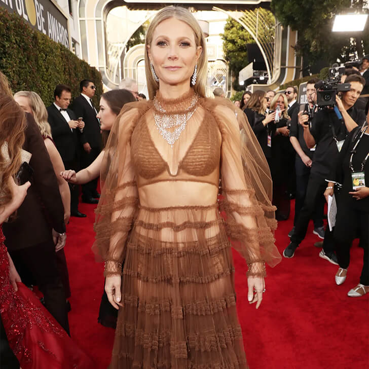 Sweeping into the 2020 Golden Globes, Gwyneth Paltrow exuded elegance in a sheer brown Fendi pre-fall gown, ethereal with its delicate lace details and chiffon layers flowing behind her. She wore nearly 100 carats of diamonds from Bulgari Fiorever, adorning herself with two necklaces, earrings, and rings that made her shine as a presenter that evening.