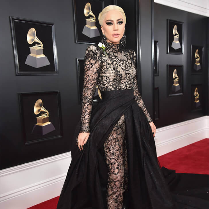 Lady Gaga never fails to captivate, and her appearance in a custom-made Armani Privé gown at the 2018 Grammy Awards was no exception. The ensemble featured a long-sleeve black lace dress with thigh-high slits and a sweeping train, embodying both elegance and edge. Famed for her theatrical flair and powerful vocals, Lady Gaga has consistently pushed the boundaries of music and fashion.