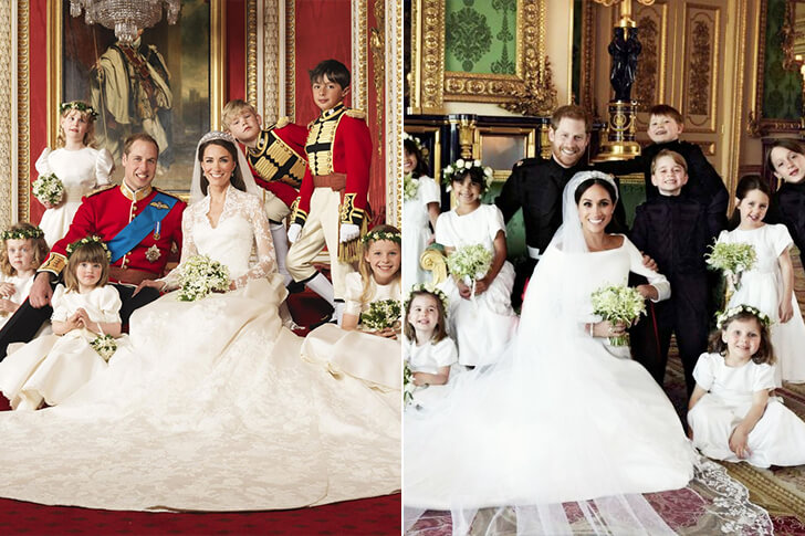 Comparing the portraits from Markle and Middleton’s ceremonies, you’d think that you were seeing double. Both grooms and their families occupied the left-hand side when taking the photo. The newlywed women and their respective families occupied the right-hand side.