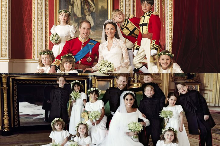 They seem to have come to a meeting of the minds, and these portraits are simply adorable. The page boys wore military-inspired outfits to William’s ceremony and the girls wore white frocks. For Markle’s day, the girls also wore white while the page boys donned black outfits.