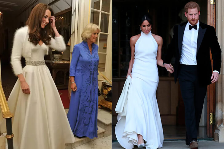 The reception symbolically represents the first time a newlywed couple hosts guests. Prince Charles took on the task of organizing the evening celebrations for his two sons. Both ladies chose stunning outfits for their respective post-nuptials events.