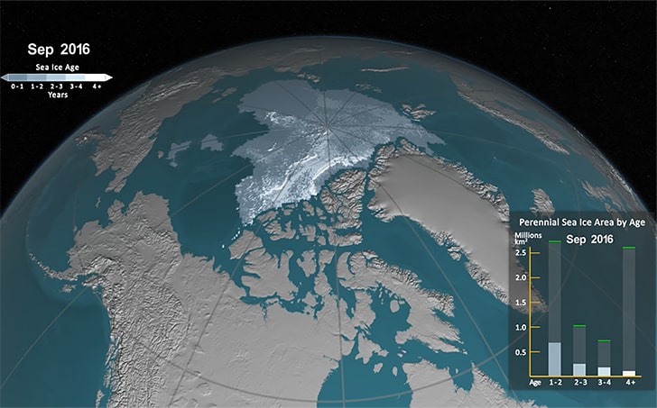 Young ice is rendered in dark blue, while ice that’s at least four years old is in white. Observing the visual more closely, you’ll notice that while the blue areas return to the same extent each year, the space the white areas occupy significantly shrink as the years pass.