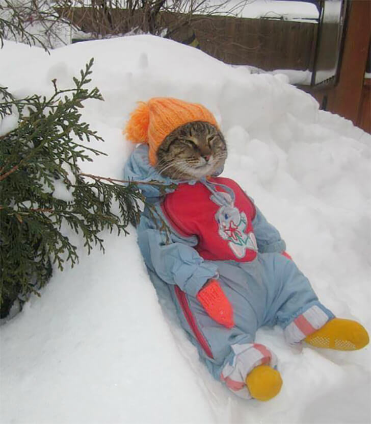 Resembling a perfectly dressed doll, this cat exudes an unexpected sense of grandma-like wisdom as she calmly lounges in the snowy setting. Contrary to the stereotype of playful and energetic felines, she chooses relaxation over frolicking.