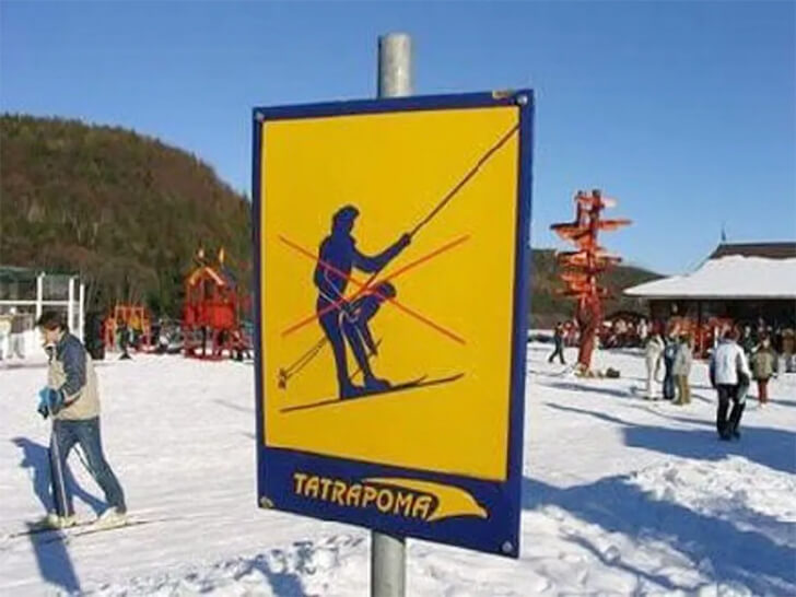 Presumably, this sign was created to caution parents against letting their children ski with them, but a quick glance could lead to various interpretations. Perhaps plain text would have avoided confusion, and now the management must consider whether to retrain their staff or recruit a replacement.