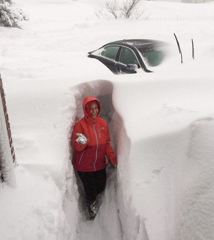 The creator of this fascinating snow maze, separating the woman from her car, undoubtedly harbors an imaginative mind! If only we could relay a message to her, guiding her to make one more turn. Her desired destination, the car, is just a few shovels away.