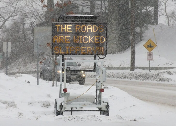 This sign takes no chances with subtlety: “It’s Wicked Slippery!” It’s a stern reminder of the perils of winter driving. However, even in the absence of such humorous alerts, drivers must always be proactive and prepared for the challenges of snow-covered roads