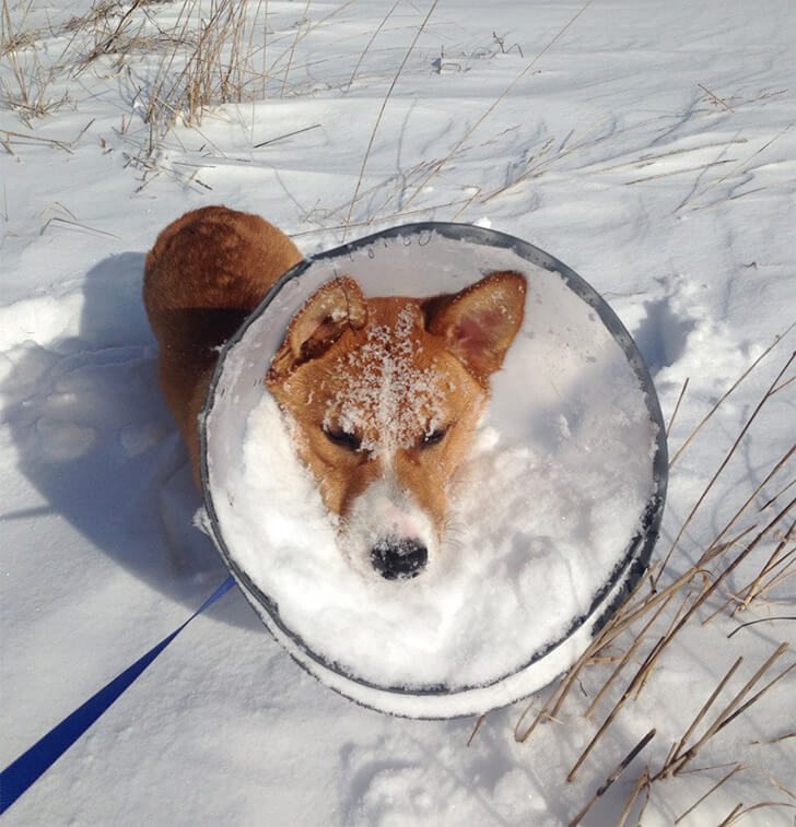 The expression of this dog, sporting the “cone of shame” while dealing with an accumulation of ice, is a bit of a puzzle. The challenge of the cone is undoubtedly difficult, yet the addition of icy encumbrances makes us empathize more. Let’s hope that his owner intervened to brighten his spirits.