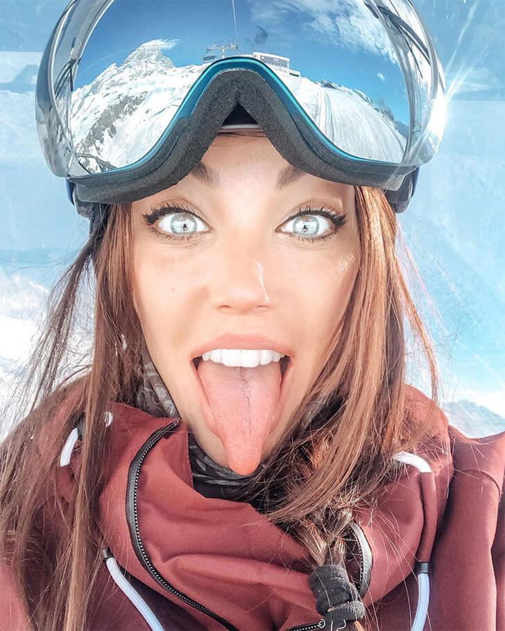 Jedes Detail dieses Bildes strahlt eine erhabene Mischung aus Eleganz und Gelassenheit aus. Die faszinierende Landschaft spiegelt sich perfekt in ihrer Skibrille wider, ihre Augen glänzen in der Sonne. Ihre souveräne Haltung strahlt eine königliche Aura aus und man fragt sich, ob sie vielleicht eine entfernte Verwandte von Disneys legendärer Schneekönigin Elsa ist.