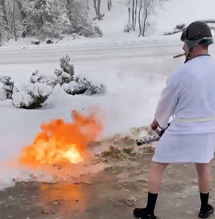 Dieser Mann aus Kentucky benutzte an einem Morgen einen Flammenwerfer, um den Schnee aus seiner Einfahrt zu räumen. Merkwürdig ist nicht nur sein feuriger Ansatz, mit dem Schnee umzugehen, sondern auch, dass er mit Bademantel, Socken und Mütze bekleidet ist. Dabei steckte eine Zigarre im Mund, was ihm ein cooles Aussehen gibt. Das von seiner Frau aufgenommene Video machte den unkonventionellen Schneeräumer schnell über Nacht zu einer Internet-Sensation.