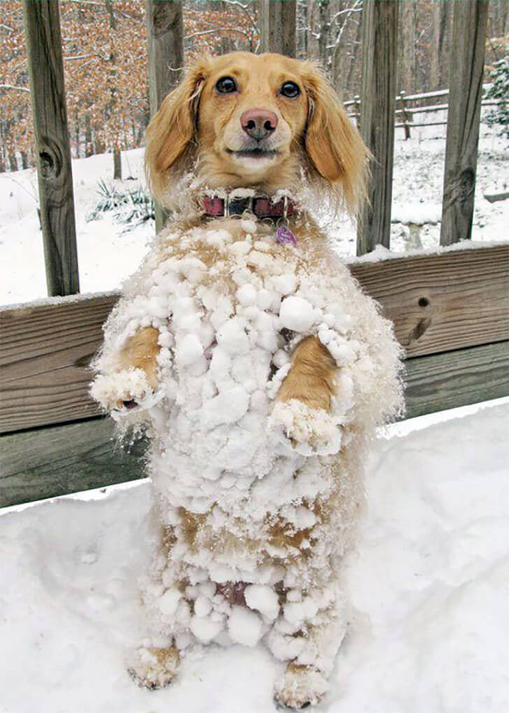 Wenn man ihr in die Augen blickt, ist schwer zu erkennen, ob sie ein Gefühl der Freude ausdrückt oder am liebsten ein warmes Bad nehmen würde. Vielleicht hatte sie Spaß daran, im Schnee herumzutollen, wie die Eisstücke an ihrem Fell beweisen. Doch vielleicht hat sie jetzt genug und möchte am liebsten nach Hause gehen, um sich aufzuwärmen und diesen Eismantel loszuwerden.