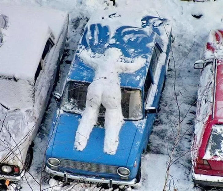 Unser verschneiter Freund hier weicht vom herkömmlichen aufrecht stehenden Schneemann ab und sieht aus, als wäre er auf das Auto gestürzt. Offenbar war er zu betrunken, um sein Zimmer zu finden, und entschied sich stattdessen für ein frostiges Nickerchen auf der Motorhaube eines Autos. Zum Glück kann ein Schneemann nicht “erfrieren”.