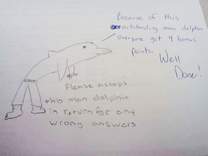 Sometimes, exams can be highly stressful, especially when your brain shuts down on you. We can go blank and start drawing unexplainable things. This student went blank, drew a man-dolphin, and made sure to cover everyone who had experienced a similar brain shutdown. At least the teacher didn’t get a terrifying image of man-sharks instead!