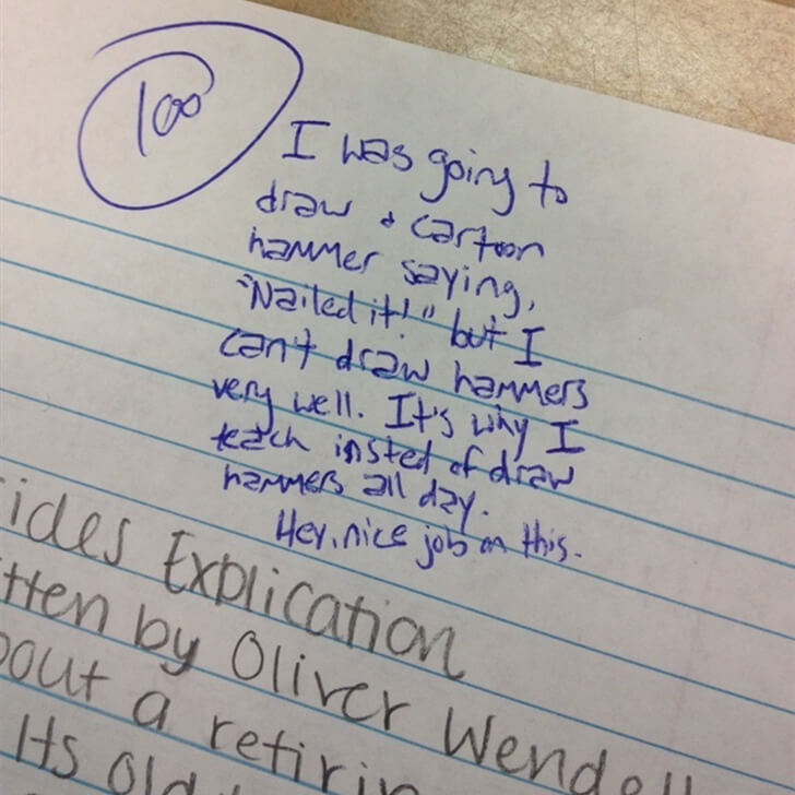 We can give him that deserved standing ovation, but what’s with the teacher? It’s funny that he chose to pour his heart out on the student’s test paper! Had the hammer been drawn, we guess the dialogue would have been more than nailed.