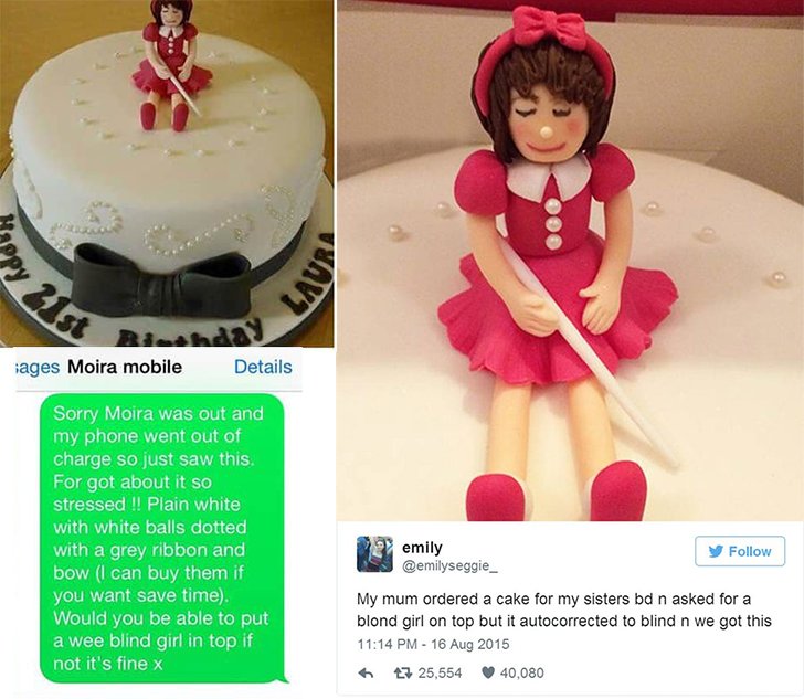 This mom thought that a small blonde girl who looked like the birthday girl would be a nice little addition to the birthday cake. But the mom’s phone autocorrected the text she wrote to the baker, instead of blonde the request was for a doll of a blind girl to be put on top of the cake. The baker isn’t to blame, he deserves all the compliments for doing exactly what was asked from him. The cane is a sensitive and clever addition of his own. Conclusion – One should read his or her own texts before and after sending them!