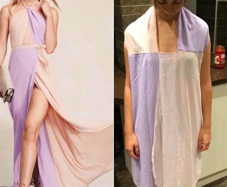 This dress looks fantastic on the model in the left picture. Its bright colors and unique style are captivating and also leave something to the imagination. We can all understand why this girl wanted to buy it! She felt quite shocked and disappointed when the package arrived. Instead of the steamy cut-out dress that would’ve perfectly highlighted her figure, the poor girl received a deformed item that resembled a window curtain more than it did a fancy dress for a classy night out. This is what you’d call a purple disaster.