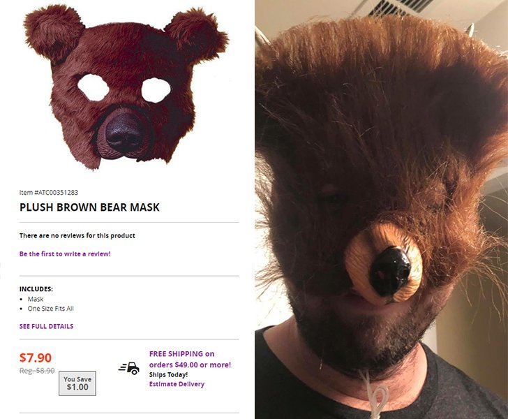 Halloween presents quite a few challenges: picking the costume, ordering it online, seeing that it fits, seeing that it’s not the ugliest thing in the world. Sometimes you get something which is not what you expected. Not at all. This guy ordered a bear mask, in the picture it even looked like a pretty good one. What he got instead was something taken out of a horror movie. Bears should be outraged for their insulting representation. Even the ugliest ones are much better-looking than the so-called bear this mask tries to depict.