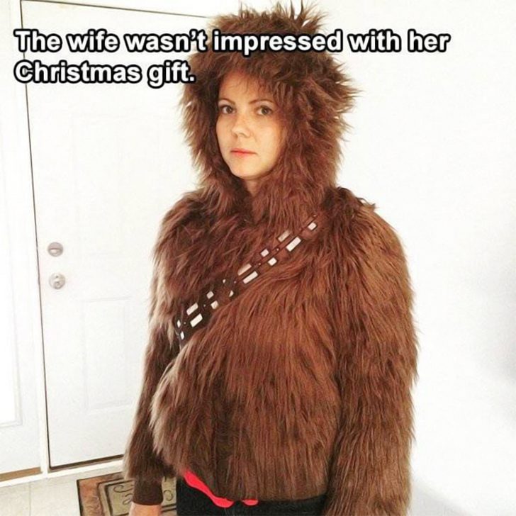 Nothing says “thoughtful gift” like a full-blown Wookiee-inspired jacket. Judging by her expression, this wasn’t exactly the galactic-level surprise she was hoping for. It’s warm, sure, but there’s only so much you can do with a look that screams, “I’m ready to join the Rebel Alliance.”