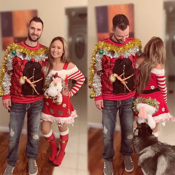 This couple fully embraced the chaos of holiday fashion, and it’s a sight to behold. From the tinsel-wrapped sweater featuring a gymnast dangling from a chimney to the candy cane dress complete with a stuffed unicorn attachment, they’re serving undiluted festive drama.