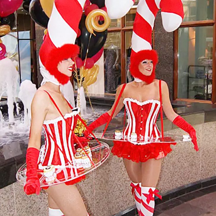 Well, here’s what happens when the Christmas spirit collides with a fashion designer who’s had one too many peppermint lattes. These two are rocking outfits that could double as festive desserts, complete with hats that scream “candy cane but make it high fashion.” Add in the trays of goodies, and they could be auditioning for a holiday-themed cabaret.