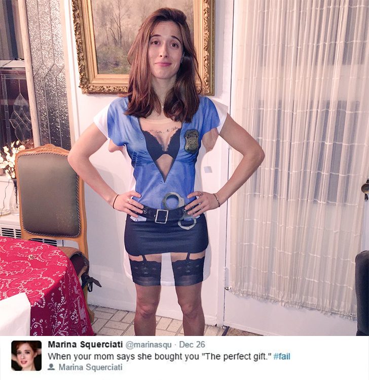 This outfit is proof that some presents are less about utility and more about good old-fashioned shock value. The snugly printed police uniform, complete with handcuffs and stockings, radiates big “last-minute gag gift” energy. The recipient is shocked, resigned, and silently asking why this is her life now.