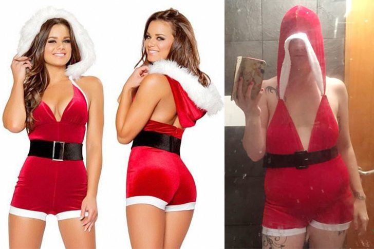 What was meant to be a sultry, holiday-themed outfit turned into an accidental fashion crime. On one side, we have the glamorous catalog version, complete with confidence and sparkly cheer. On the other, the real-life rendition—an awkward hooded struggle with questionable fit and zero Santa swagger.