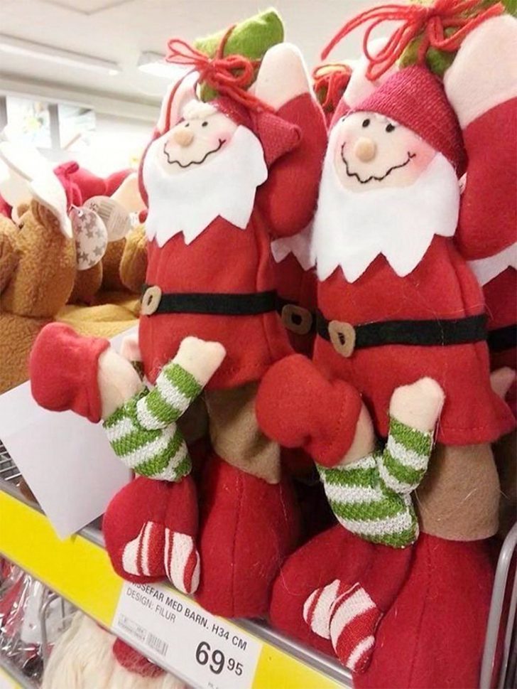 Can you tell someone had a bit too much eggnog while designing these festive dolls? What starts as a cheerful Santa holding a smaller figure quickly turns into a comedy of poor placement. Let’s just say those green-and-white striped legs aren’t positioned in the most innocent of ways, so everyone who sees it is guaranteed to do a double take.