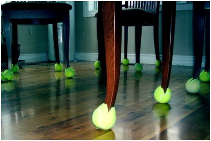 We bet you’ll cry with relief when you hear this neat trick. Bring out all those tennis balls, tear them open a bit, and stick them on the feet of the chairs. If you own only one or two of the house items we speak of, you are sure to buy more just for this purpose.