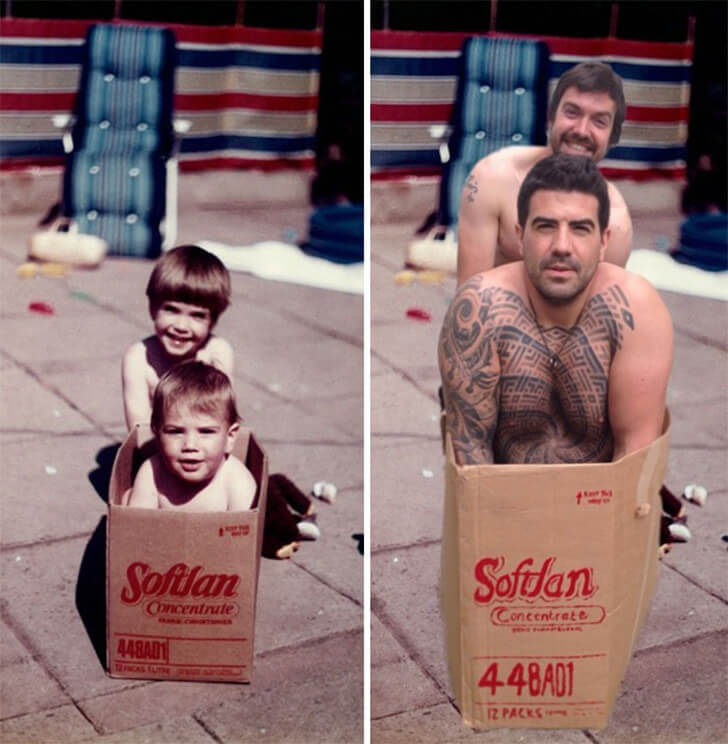 These brothers still had the same size and stare as when they were kids. We thought they had done an amazing job in finding a box of the same design but upon closer look, we can tell that someone’s Sharpie skills are on point! To be fair, the guy in front wouldn’t have been able to fit in the same box size.
