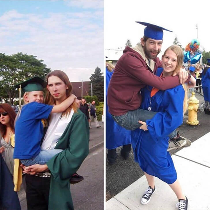 This duo added a twist to the “then and now” challenge. Instead of recreating their childhood image, they decided to switch roles for the more recent picture, and we’re totally in awe of how precious this might have been for them. Graduating is something to be extremely proud of and judging by these expressions, they were happy with each other’s accomplishments.