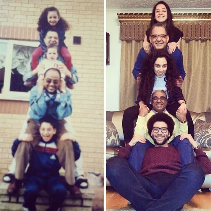 When the kids were little, it was easier to ace this pose but when they grew up, it must have been difficult to recreate this family picture. Is this what you call a “family tree”? According to the Reddit user who uploaded this photo, the man second from the top is the father while the second from the bottom is his friend.