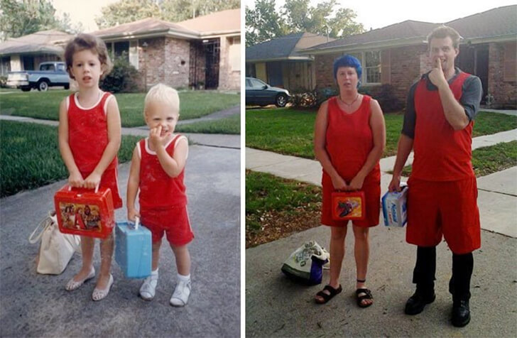 For their mom’s birthday, these siblings decided to recreate their 1986 childhood photo taken at their New Orleans old house in 2011! Although there were key differences, including their jerseys, bags, and lunch boxes, the most obvious would be their ‘dos! The woman changed her brunette locks to blue while he had switched his blonde strands for darker tresses.
