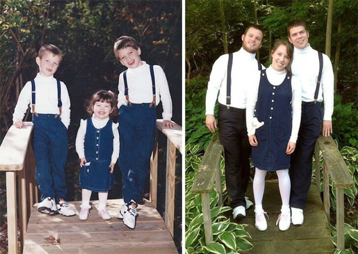 How on earth did these people find the exact clothes from their childhood photo in bigger sizes? Well, we think that they had new ones made just for this challenge — from their suspenders to turtlenecks and stockings, every bit is on point! We must say that they do look fashionable then and now.
