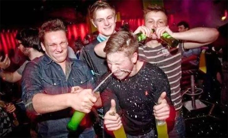 We just hope when the party is done and over with, the young man in the front can still see. It looks like his friend has popped open some sort of alcoholic drink with carbon dioxide and it has gone straight into his friend’s eyes.