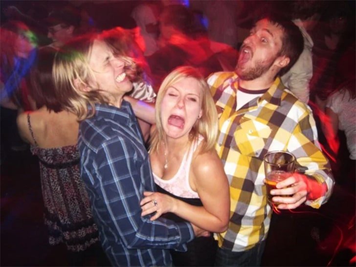 There can be two potential stories behind this picture. It’s either a bad angle with bad lighting or the picture was captured when the woman was in a moment of agony. Drinking could have triggered a bad memory. It could explain the men in the picture hugging her, perhaps they were consoling her