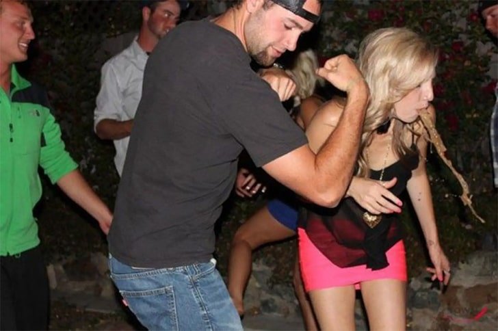 It looks like the woman has no interest in the number of hours the man has spent at the gym to develop his biceps. She seems disgusted by it as she lets out a stream of vomit. The man shouldn’t take it personally, it was probably due to excessive drinking.