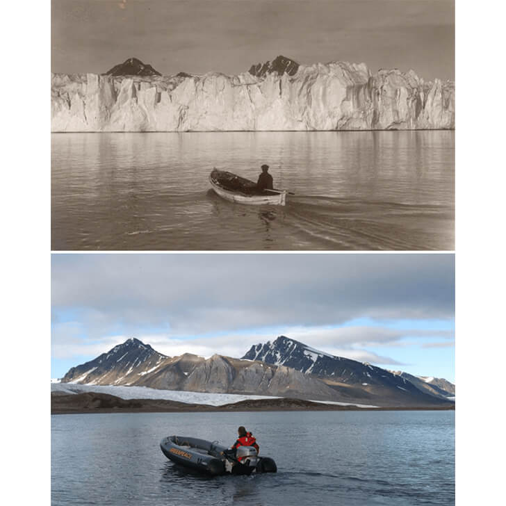 Now, here’s a saddening size comparison. Believe it or not, these two pictures show the same spot in the Arctic. Taken about a century apart, the massive difference between their ice coverage really shows us the accelerated melting of the North Pole’s glaciers.