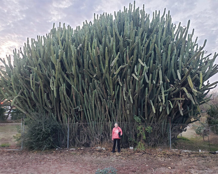 Because most cacti don’t have leaves, they tend to grow slower than other plants. But don’t do be surprised to encounter a cactus as large as this mountain-like bush. Judging from its tall height and columnar appearance, this impressive plant is most likely a Cereus peruvianus (also referred to as Cereus repandus).