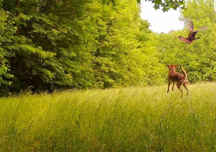 Von einer Katze geht es nun zur Gattung der Hunde. Der junge Kojote auf diesem Bild beweist uns, wie hoch er springen kann. Dafür war nur ein vorbeifliegendes Rebhuhn nötig, um bei ihm alle Kräfte freizusetzen. Wilde Hunde, wie der Kojote, haben ja von Natur aus einen angeborenen Jagdinstinkt. Wie sich dieser bereits bei Jungtieren auswirkt, können wir hier deutlich sehen. Bis über das hohe Gras hinaus springt er hier in die Lüfte, um den Vogel zu reißen. Doch der hat in der Luft einen großen Vorteil und fliegt dem kleinen Kojoten davon. Dieser kann nur noch hinterherschauen. Bei uns löst dieser Schnappschuss ein Schmunzeln aus.